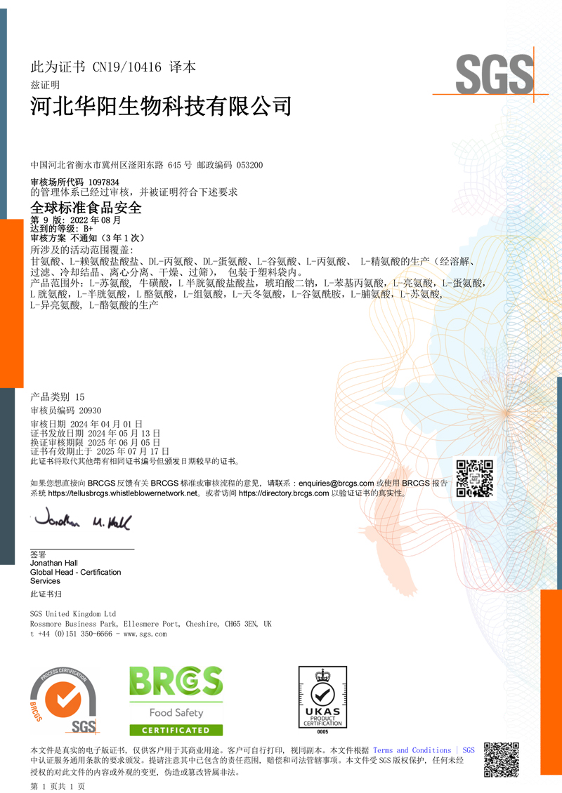 河北華陽集團(tuán)坐落于河北省衡水市冀州區(qū)省級工業(yè)園區(qū)(始建于1987年,前身為冀州市華陽化工有限責(zé)任公司)。集團(tuán)下屬四個公司:河北華陽生物科技有限公司、河北華悅氨基酸科技有限公司、滄州華晨生物科技有限公司、衡水市陽力商貿(mào)有限公司。主要生產(chǎn)甘氨酸、L-丙氨酸、L-蘇氨酸、DL-蛋氨酸、L-賴氨酸鹽酸鹽、L-半胱氨酸鹽酸鹽、干貝素等氨基酸系列食品級產(chǎn)品,廣泛應(yīng)用于食品、飲料、飼料等行業(yè)。......